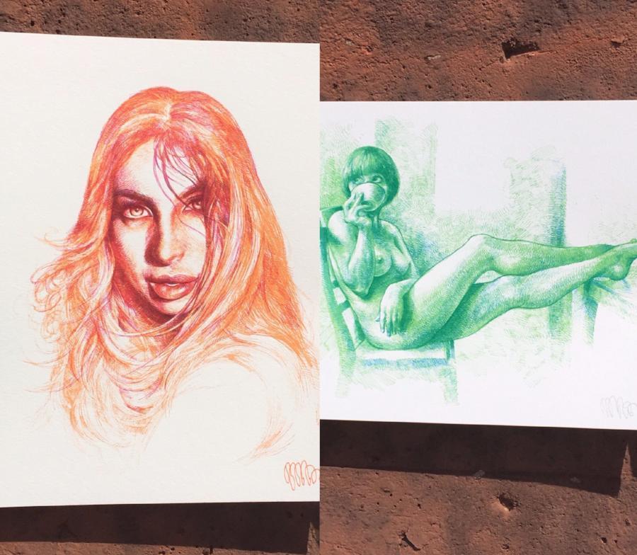 The two artists created a series of images which were screenprinted by our own Ben LaFond and guest printer Gemma Berenguer on top of custom colorful monoprints created by the two printers. Each print is completely one-of-a-kind.