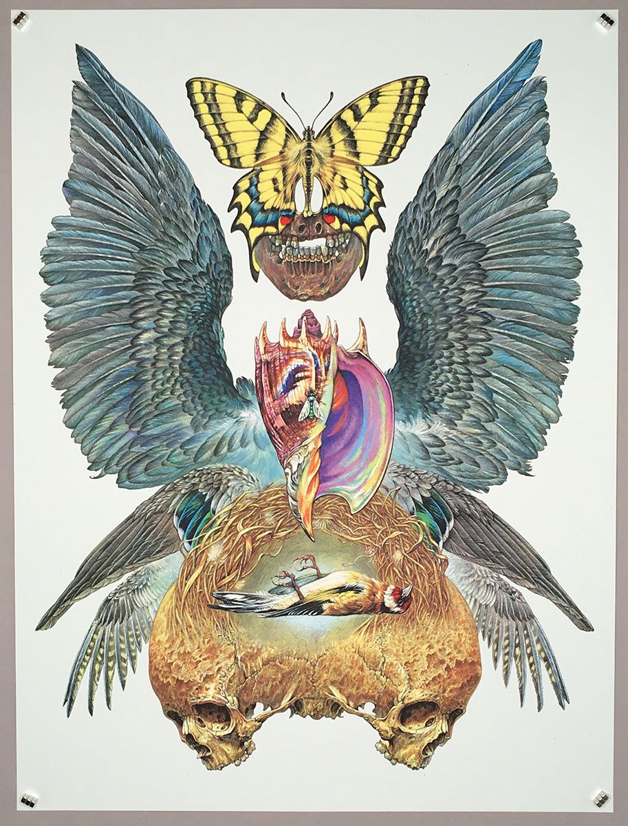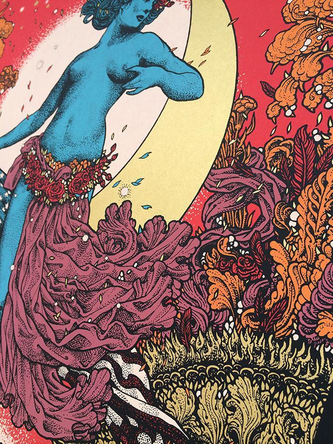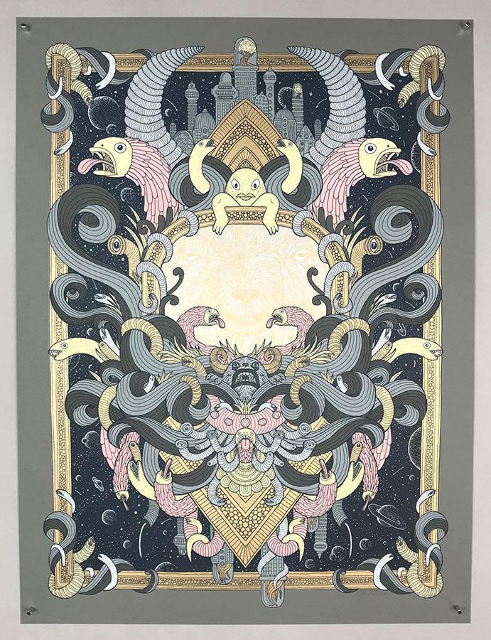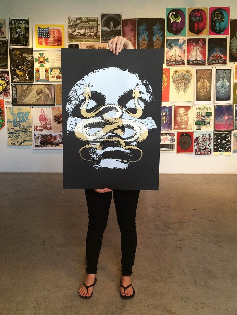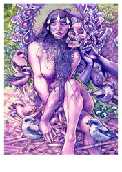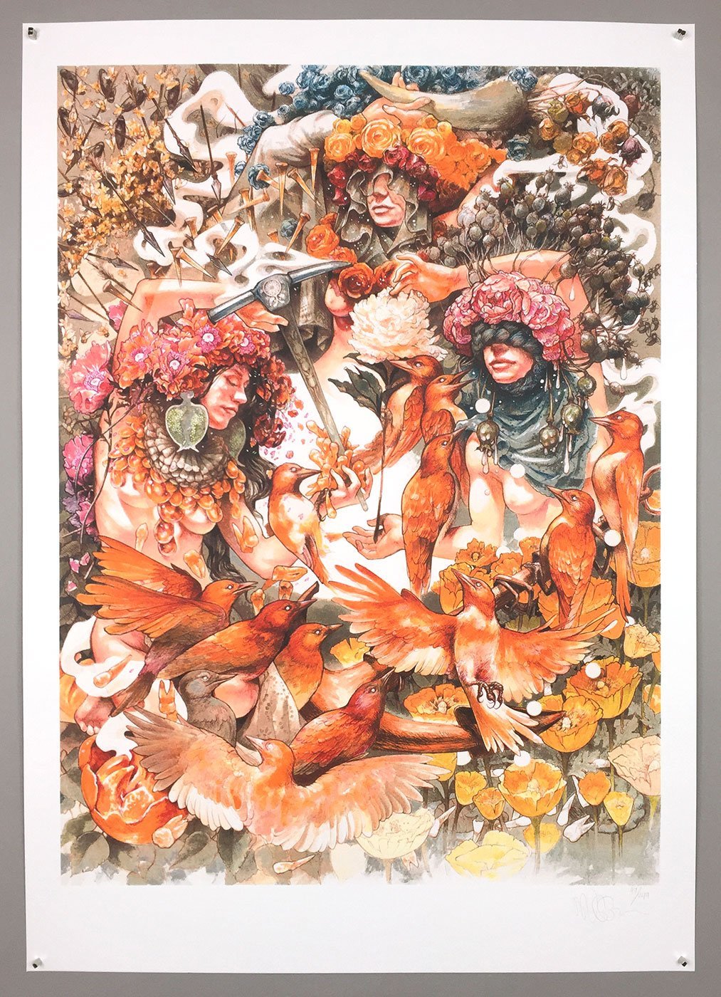 Another multi-colored screenprint from our Dutch friend Marald Van Haasteren doing what he does best. Seamlessly mixing symbols of life and death, Marald brings his unique style front and center in this gorgeous piece.