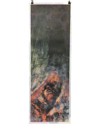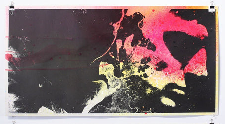 Heavyweight 100% cotton archival paper was hand-treated with spraypaint, marbling, and gouache. Finished with one screenprinted layer of translucent black ink.
