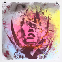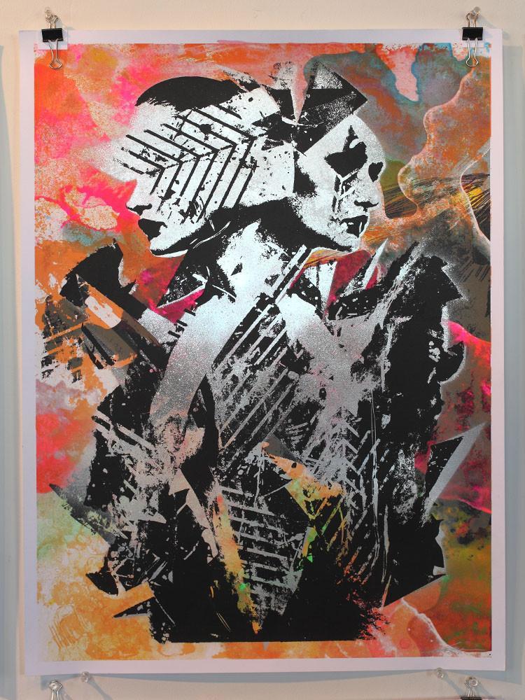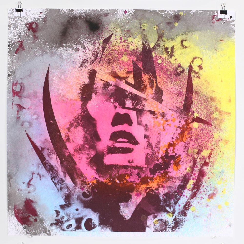 The process began with test prints from Bannon's All We Love We Leave Behind art print series, screenprinted here in our studio on 100 lb. heavyweight paper. A hand-painted film was used to expose a screen for the first new screenprinted layer. White and / or silver spraypaint was applied using a hand-cut stencil. Finally, the main image was screenprinted using flat black ink.
