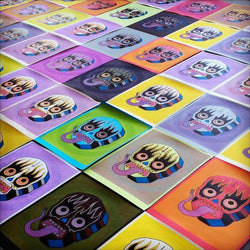 Beginning with screenprinted background printed in our studio by Sarah Schatz, the artists painted on top of them, creating a vast array of heavily-textured, hand-painted images on thick paper. Finally, the feature image layers were screenprinted on top by Sarah.
