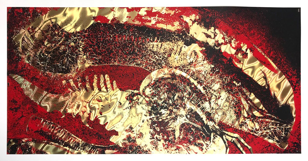 Jacob Bannon's "The Perfect Organism" is inspired by H.R. Giger's "Necronom IV". His legendary design went on to become the foundation of the ever-evolving creatures in the Alien film franchise. Jacob's interpretation is a take on the first versions of the skeletal monster (his favorite incarnation). It was created using collage, gouache, ink, and spray-paint on mylar and paper.