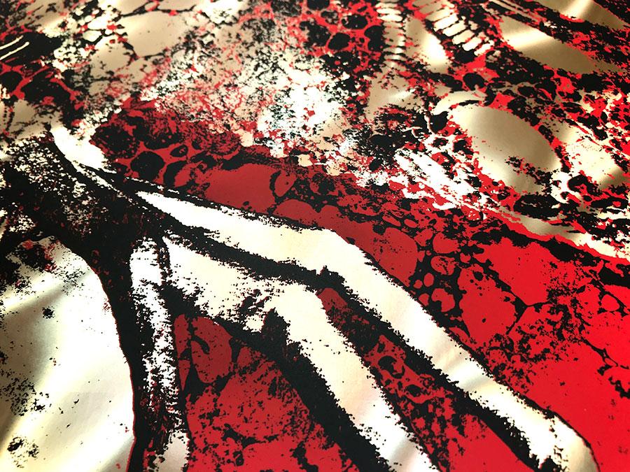 Heavyweight 100% cotton archival paper was hand-treated with spraypaint, marbling, and gouache. Transparent white and flat black ink were then screenprinted on top.