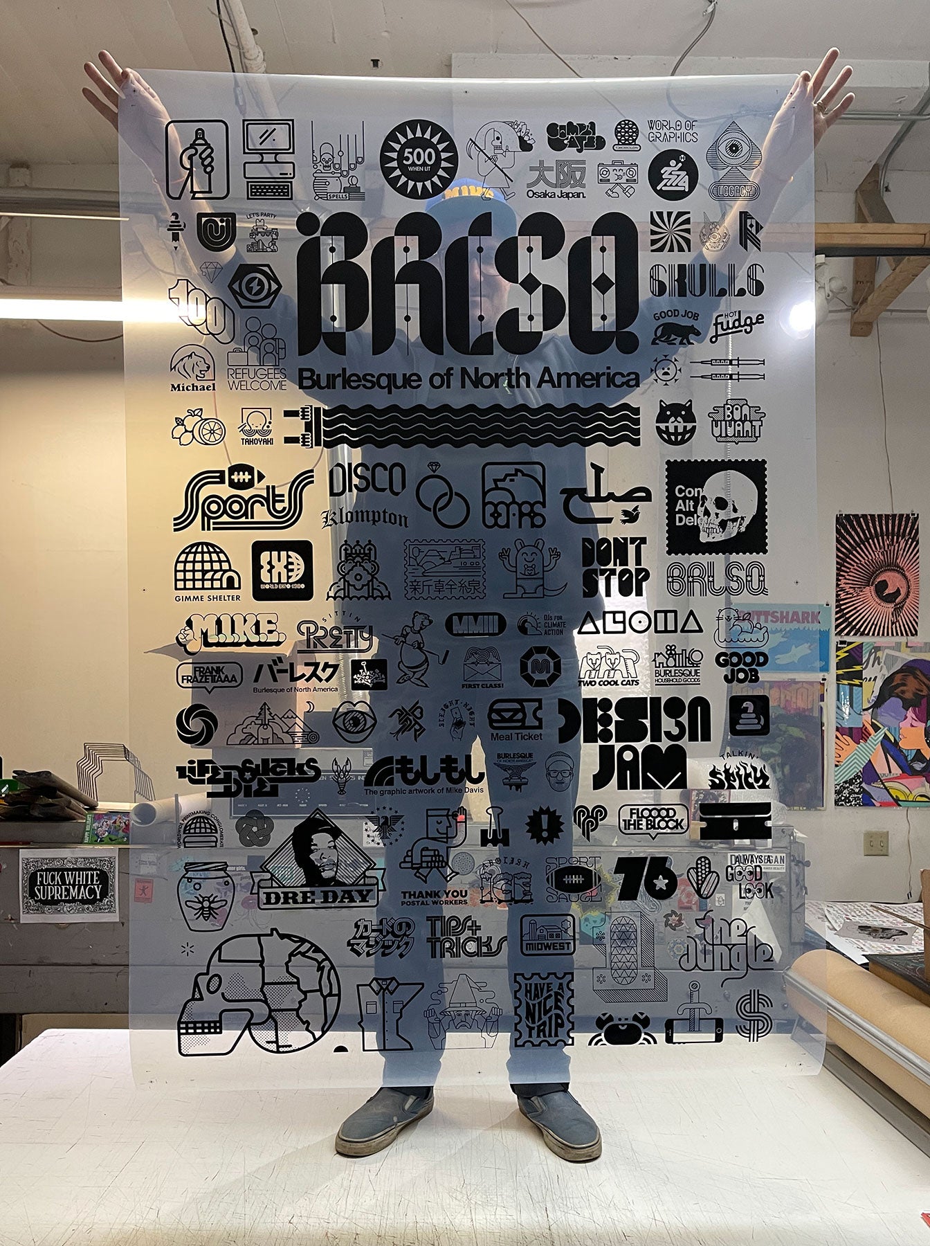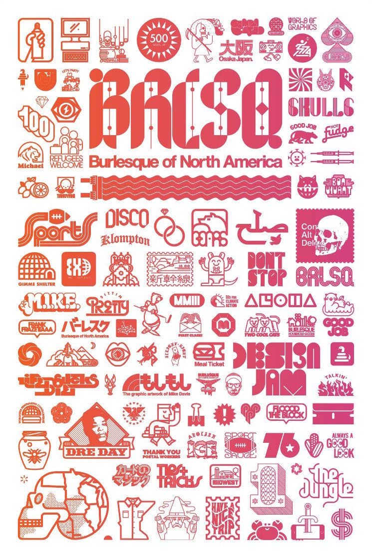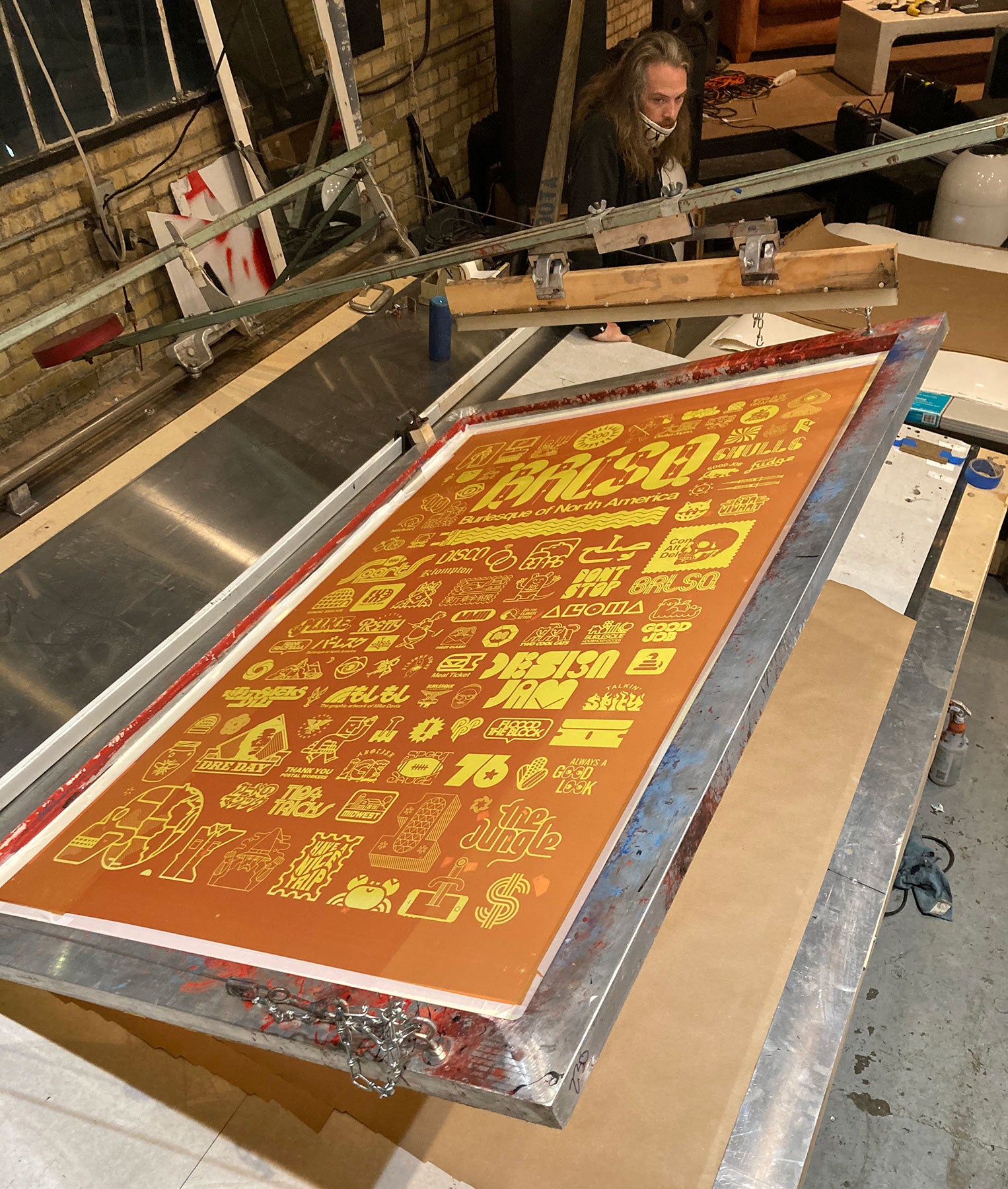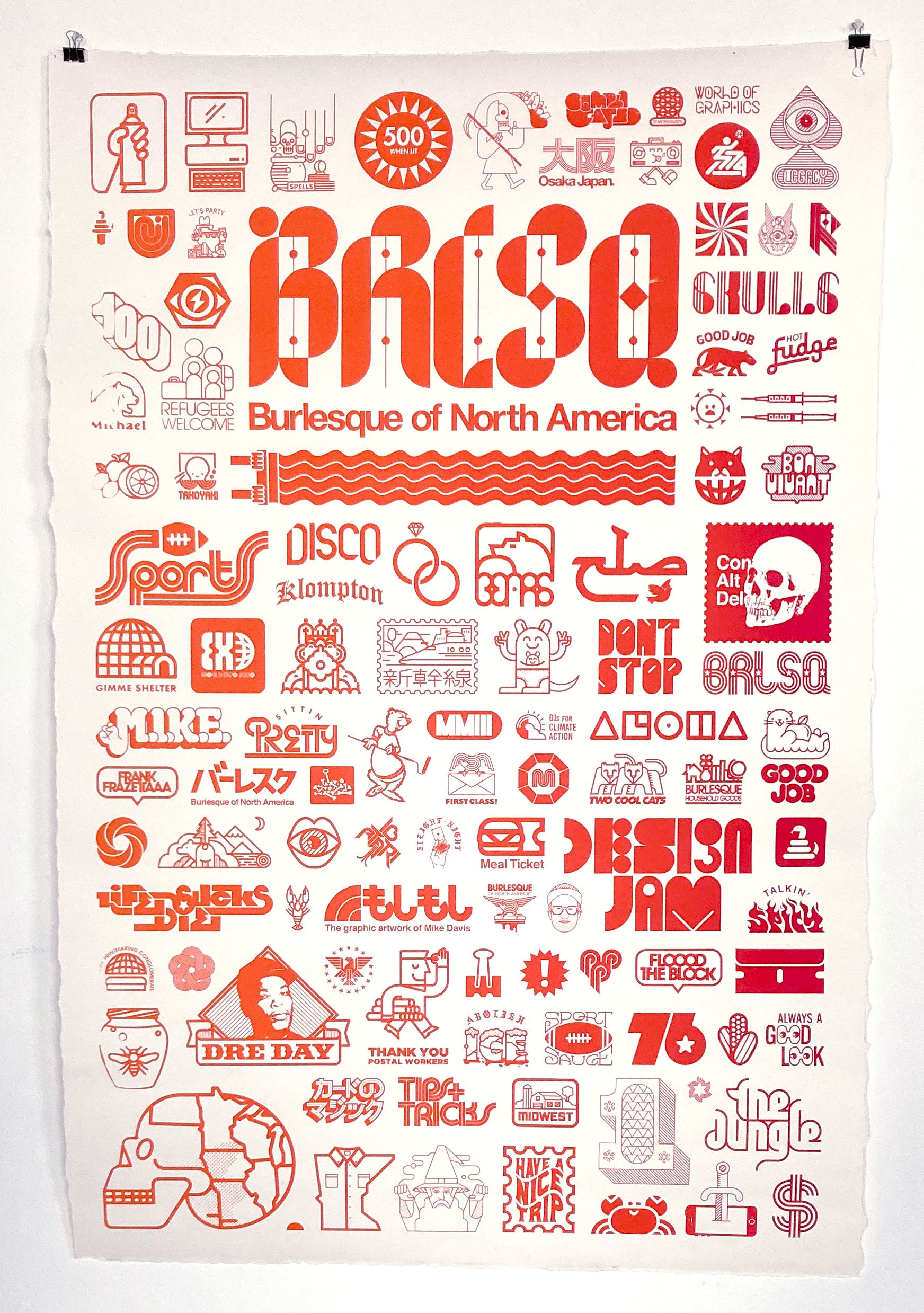 This brightly-colored split fountain of ink washes through a vast collection of logos designed over the years by our own Mike Davis. We even hand-deckled the edges of the paper for that extra fine touch.