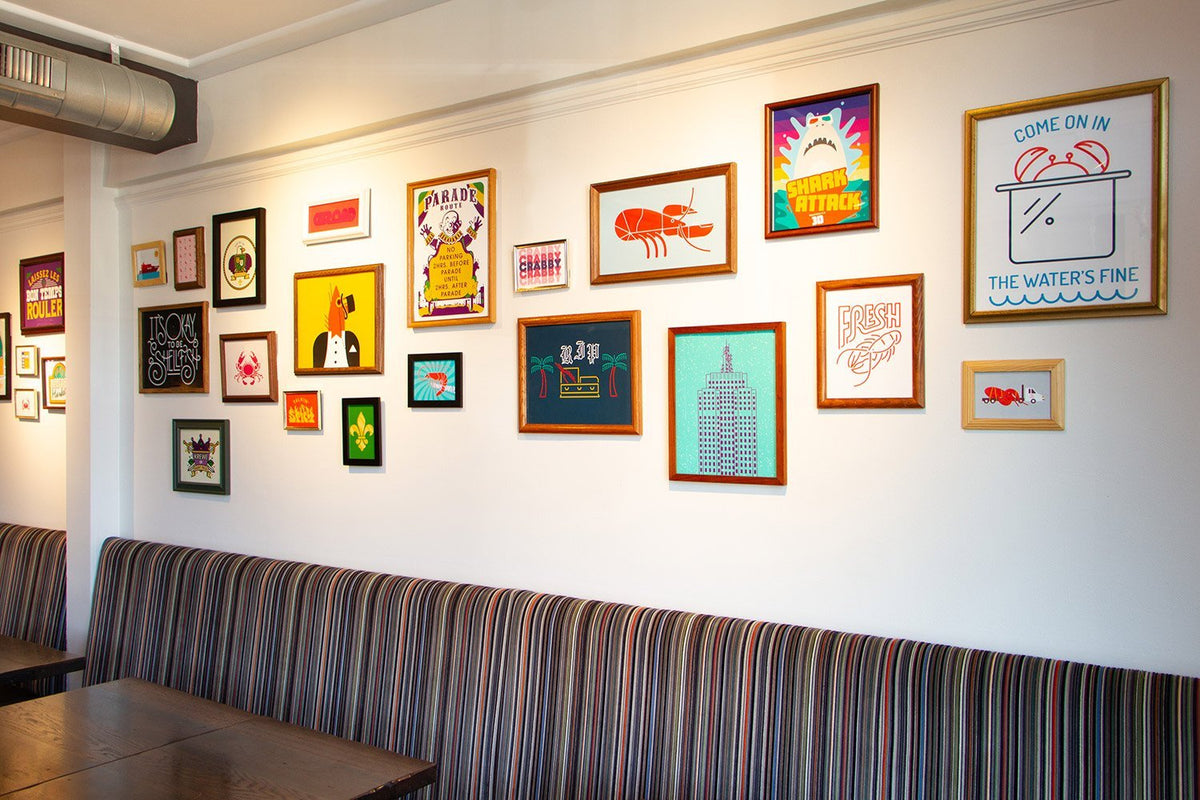 For the design, Mike Davis went for a clean, contemporary approach with some nods to New Orleans, producing a wide range of items including the exterior signage, interior neon signs, a wheatpasted mural comprised of screenprinted posters, food and drink menus, and over 20 original framed art pieces. Stop by 1672 Grand Ave in Saint Paul to see and taste it yourself!