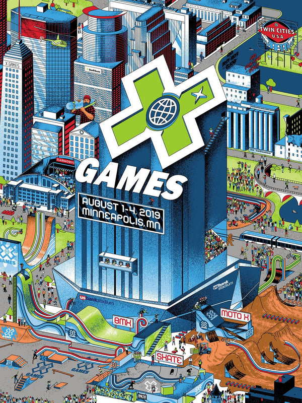 To welcome X Games to our city for the third straight year, we designed a poster which envisions downtown Minneapolis as a free-for-all skateboard / BMX / motocross park overflowing with X Games athletes and crew, action sports activity, plus a handful of locally-themed Easter eggs. The artwork is a hybrid of Mike Davis' vector illustration work with Wes Winship's creative direction and detailed Photoshop textures.